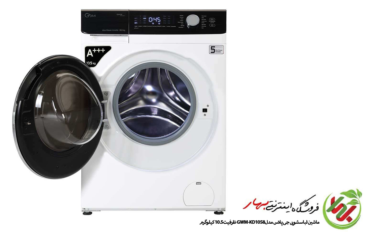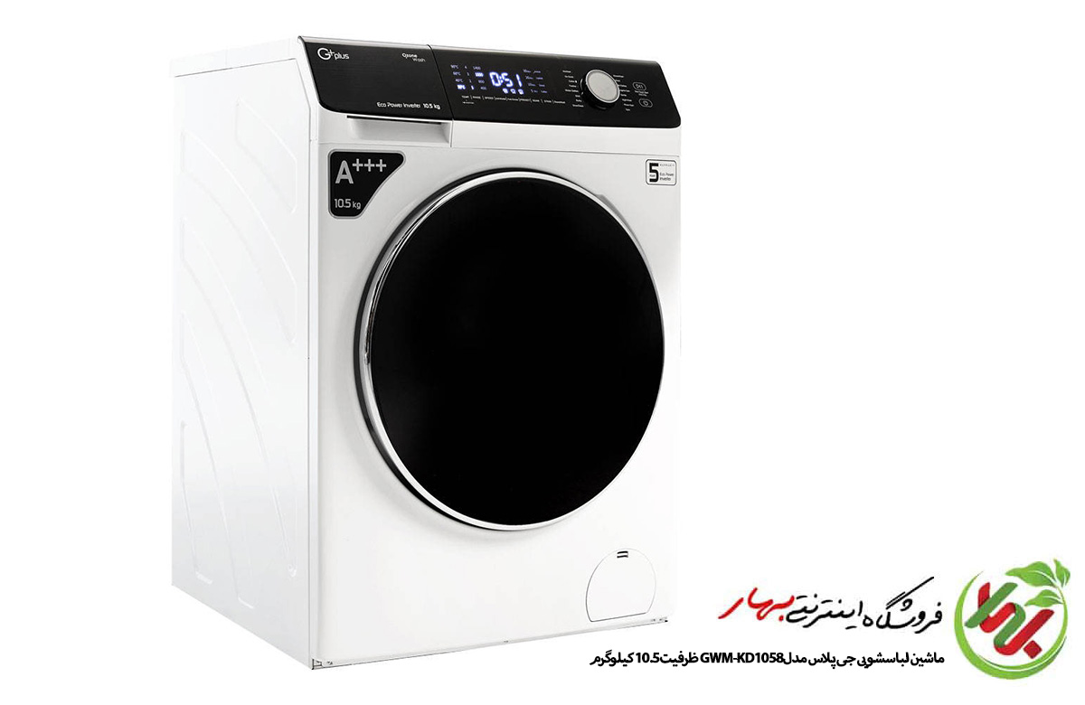 مشخصات و امکانات ماشین لباسشویی جی پلاس مدل GWM-KD1058 ظرفیت 10.5 کیلوگرم در رنگ های سفید و تیتانیوم