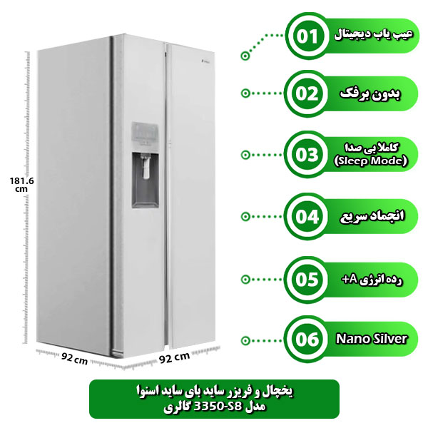 ابعاد محصول نیز در هنگام جا به جایی مهماند و این ابعاد برابر 6/181 سانتیمتر ارتفاع و عرض و عمق، هرکدام 92 سانتیمتر هستند. گرید مصرف انرژی یخچال ساید اسنوا برابر با A+، به دلیل بهرهمندی از کمپرسور اینورتر دیجیتال است. در ادامه مباحث بعدی شما را با مشخصات و ساختار داخلی هر یک از کابینهای یخچال و فریزر آشنا میکنیم.